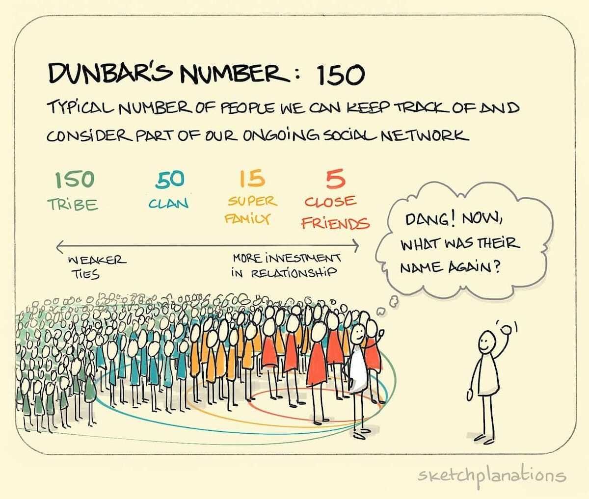 Facebook was founded on the principle that one could maintain a connection to a significant, yet limited, number of individuals. Ironically, also through Facebook, a suggestion was made to check out this guy in England - Dunbar - who said a person could realistically maintain a connection to 150 friends. I used the 150 figure, Dunbar’s number, as the target for the community of practice at Pearson. Again, it was a large company with over 30,000 people. A smaller number works too.